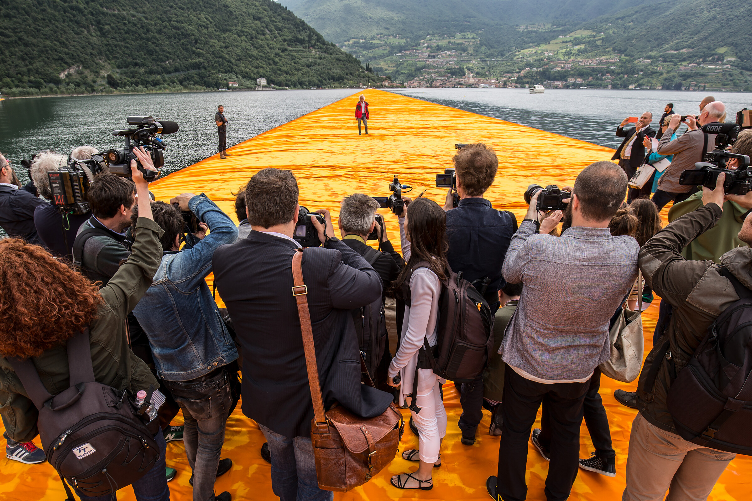 Vor dem malerischen Bergpanorama der italienischen Alpen realisierte der legendäre Installationskünstler Christo 2016 auf dem Lago d‘Iseo seine «Floating Piers». Mit leuchtend gelben Stoffbahnen bespannte Stege aus schwankenden Pontons verbanden die beiden Inseln Monte Isola und San Paolo mit dem Ufer und zeichneten ein abstraktes Kunstwerk in die Landschaft. Das Werk existierte nur für 16 Tage, ermöglichte es aber über 1,2 Millionen Besuchern auf dem Wasser zu laufen.